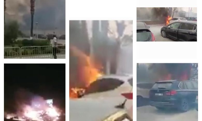 فبمحطة القطار ،اندلع لهيب النيران بأشجار النخيل التي توجد عند مدخل محطة القطار،مما خلف ذعرا و رعبا في صفوف المسافرين و المرتادين على المحطة،فيما تناقل الزوار أشرطة فيديو للنيران و الدخان الكثيف الذي غطى سماء المنطقة.