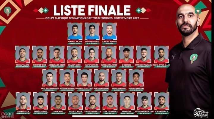 أعلن وليد الركراكي مدرب المنتخب الوطني الأول، اليوم الخميس، قائمة اللاعبين الذين ستوجه لهم الدعوة للمشاركة في نهائيات كأس أفريقيا للأمم التي ستحتضنها كوت ديفوار في الفترة الممتدة ما بين 13 يناير و11 فبراير 2024.