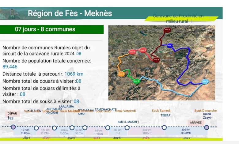 ووفق المعطيات الرسمية الخاصة بالمسار الجهوي، ستمتد القافلة على مدّة أسبوع كامل، وتشمل 08 جماعات قروية، حيث ستقطع فرق الوزارة مسافة إجمالية تصل إلى 1069 كيلومتراً، موزعة على عدد من المراكز القروية والأسواق الأسبوعية والدواوير.