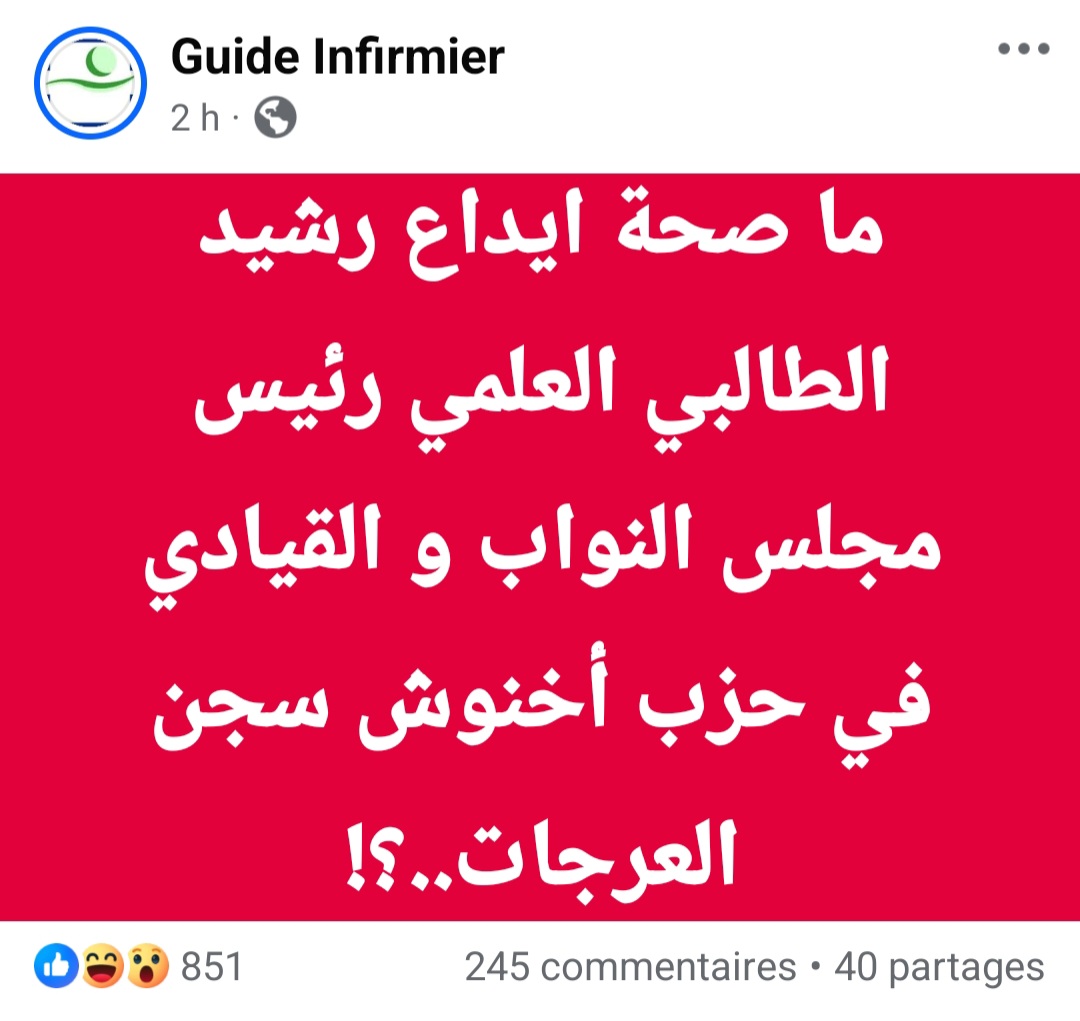 وسط زوبعة من الأخبار الزائفة التي اجتاحت منصات التواصل الاجتماعي خلال الساعات الأخيرة، تصدّرت شائعة مغرضة مفادها أن السيد رشيد الطالبي العلمي، رئيس مجلس النواب، قد تم اعتقاله وهو رهن الاعتقال الاحتياطي بسجن العرجات. وقد تداولت هذه الأكذوبة عشرات الصفحات الفيسبوكية والحسابات المشبوهة، بشكل متزامن ومنسق، في ما يبدو أنه حملة منظمة تستهدف قيادات بارزة بحزب التجمع الوطني للأحرار.