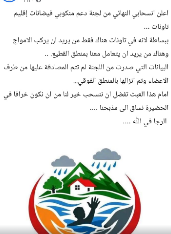 الاستقالة لم تكن قراراً عابراً، بل جاءت – حسب ما ورد في التدوينة المنشورة – بعد اتضاح أن بعض البيانات الصادرة لم تحظ بمصادقة جميع الأعضاء، وأن هناك توجهاً لإقحام اللجنة في حسابات “المنطق الفوقي” وصراعات جانبية لا علاقة لها بآلام الساكنة التي تضررت من الفيضانات.