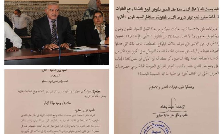و أمام الصراع القائم بين رئيس مجلس جماعة صفرو و شركة التدبير المفوض لقطاع النظافة “أوزون”،و الذي وصل إلى تفجير حقائق خطيرة وجب البحث فيها من طرف الجهات المختصة و المتمثلة في التأثير في القرار العمومي و استمالة المنتخبين وممارسة الضغط.طالب وشاك في رسالته الى وزير الداخلية إلى العمل على حل المجلس بسبب “البلوكاج” المفتعل حسب رسالته.