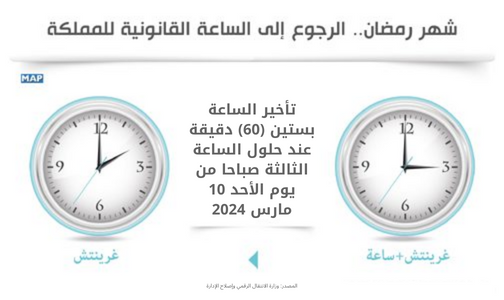 أعلنت وزارة الانتقال الرقمي وإصلاح الإدارة أنه بمناسبة حلول شهر رمضان المبارك، سيتم الرجوع إلى الساعة القانونية للمملكة (GMT)، وذلك بتأخير الساعة بستين (60) دقيقة عند حلول الساعة الثالثة صباحا من يوم الأحد 10 مارس 2024.