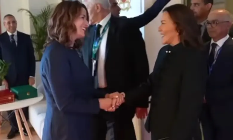 و كانت قد ظهرت وزيرة المظلة التي سقطت فجأة لتتم صباغتها بألوان حزب “الأصالة والمعاصرة” المشارك في الحكومة، وهي تصافح صاحبة السمو الملكي الأميرة للا حسناء ، رئيسة مؤسسة محمد السادس لحماية البيئة، في دبي على هامش مؤتمر المناخ، بطريقة فجة وكأنها تصافح إحدى صديقاتها وتمسك بيديها على يد شقيقة الملك.
