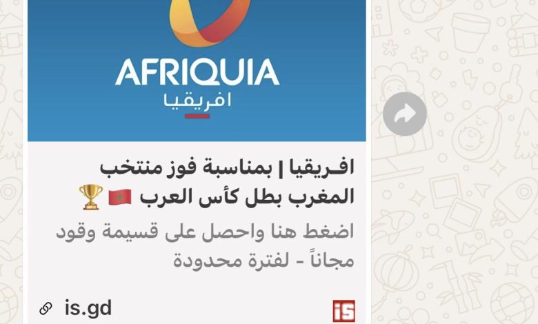 انتشر أمس السبت على تطبيق واتساب حملة احتيال إلكتروني خطيرة تستهدف مستخدمي الهواتف المحمولة في المغرب، عبر رسائل تحمل رابطًا يزعم حصول المرسل له على هدية من شركة تُدعى “إفريقيا” تتضمن تذكرة شحن أو جائزة قيمة، الأمر الذي دفع العديد من المستخدمين إلى مشاركة الرابط، دون أن يدركوا أنه في الحقيقة خدعة خبيثة تهدد خصوصية بياناتهم وسلامة هواتفهم.