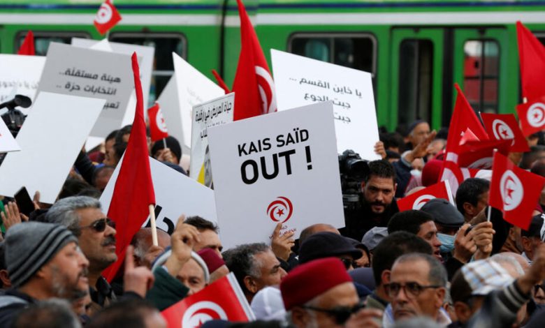 وطالب متظاهرون في تونس بإنهاء عهدة حكم الرئيس قيس سعيد وتحديد موعد للانتخابات الرئاسية القادمة خلال مظاهرة دعت إليها جبهة الخلاص الوطني المعارضة.