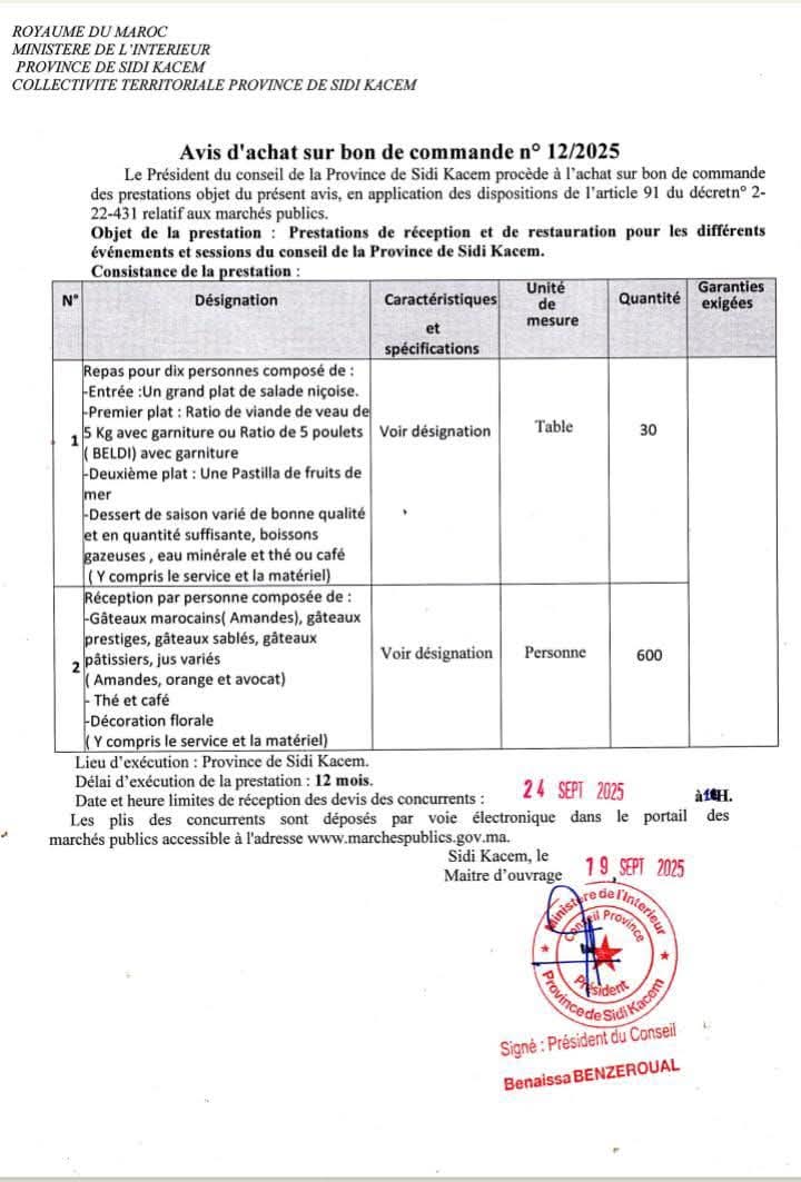 و فضيحة مدوّية تهز إقليم سيدي قاسم، حيث لم يكد المسؤول الذي غادر المحكمة متابعاً في حالة سراح يجفّ حبر قضيته، حتى بادر إلى توقيع صفقة تشمل 30 مائدة فاخرة لعشرات الضيوف، و600 شخص مدعوين لولائم وحفلات استقبال. الوثيقة الرسمية تكشف عن طلب وجبات مترفة من لحوم العجول والدواجن البلدية و”بسطيلة” بالبحر و فواكه الموسم الجيدة و حلويات راقية وعصائر متنوعة، إضافة إلى ديكور زهري وشاي وقهوة، وكأننا أمام قصور مترفة لا إقليماً يرزح تحت الفقر والخصاص. أليس الأولى توجيه هذه الموارد إلى تنمية التعليم والصحة والبنية التحتية بدل بعثرة المال العام في ولائم الولاء والتباهي؟ وأي رسالة تُوجّه للمواطن البسيط الذي يكتوي بغلاء المعيشة، بينما تُصرف الملايين على موائد عامرة بالترف؟