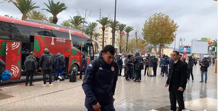 وصلت الحافلة المقلة للمنتخب التونسي عبر الطريق السيار، حيث رافقتها إجراءات أمنية مشددة شاركت فيها وحدات من الدرك الملكي و الأمن الوطني لتأمين المسار، وصولاً إلى وسط المدينة. وبمجرد دخول البعثة إلى شارع الحسن الثاني، حيث يقع الفندق المصنف المخصص لإقامتها، وجد اللاعبون في استقبالهم حشداً كبيراً من أبناء الجالية التونسية المقيمة بالمغرب، والذين امتزجت أصواتهم بأهازيج الترحيب المغربية، في مشهد يجسد عمق الروابط الأخوية وحفاوة الاستقبال التي تخص بها المملكة ضيوفها.