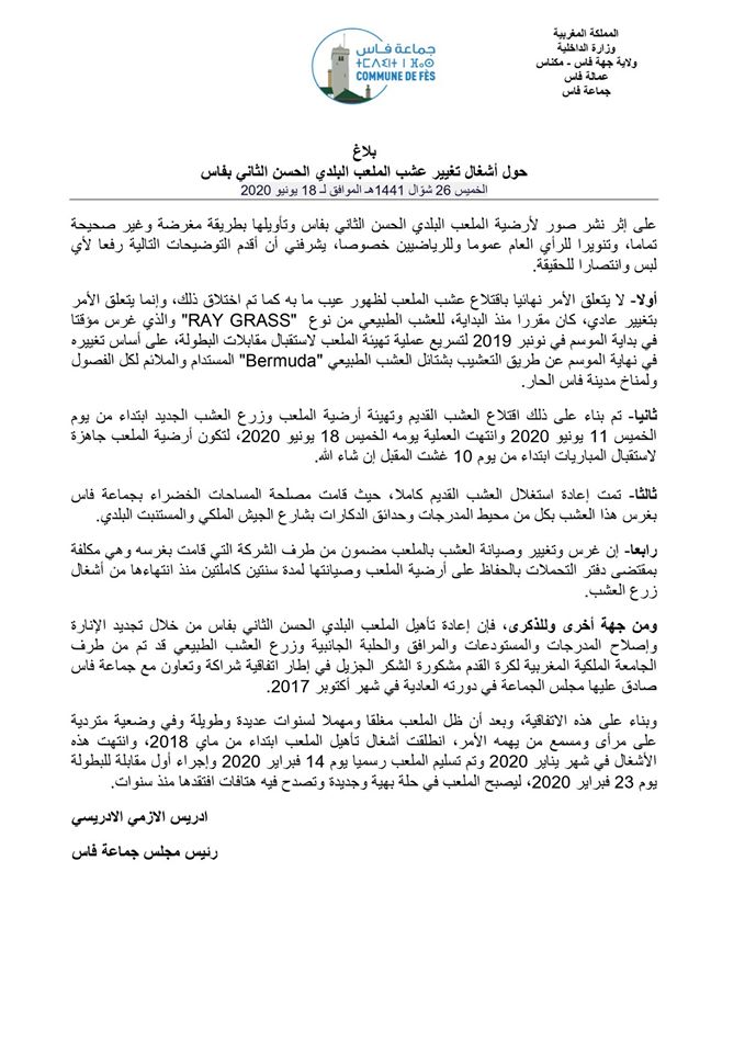 العمدة الازمي في بلاغه تحدث على أنه تم غرس العشب المزور و الغير الصالح للعب الكرة بجوانب الملعب و كذلك تم توجيه كمية ضخمة إلى منبت الجماعة،و كيف سيتم الحفاظ عليه،و ما هي الأموال التي صرفت عليه لكي يبقى حيا ولم يتعرض للهلاك.