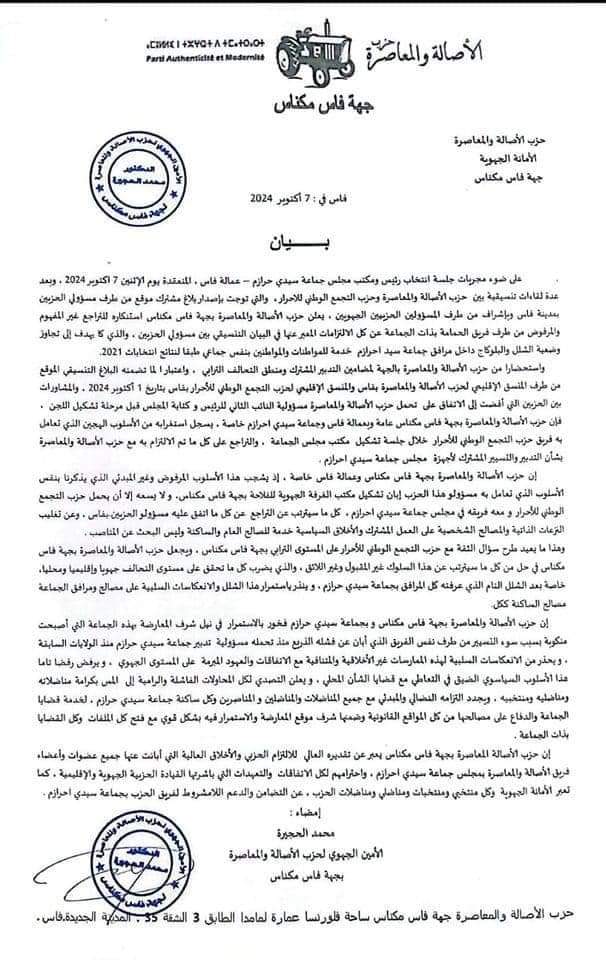 أحجيرة المنسق الجهوي لحزب الاصالة و المعاصرة و في محاولة ذر الرماد في العيون بعد أن فشل في تدبير التحالف قرر ان يبرق بلاغا ناريا و الذي قد يكون بمثابة فك الارتباط مع حزب التجمع الوطني للاحرار بجهة فاس مكناس بعد ان تم خدلانه بجماعة سيدي أحرازم،و قال احجيرة انه “يستنكر التراجع الغير المفهوم و المرفوض من طرف “الحمامة” عن كل الالتزامات المعبر عنه في البيان التنسيقي و الذي كان يهدف الى تجاوز “البلوكاج” الذي خلفه الرئيس السابق .