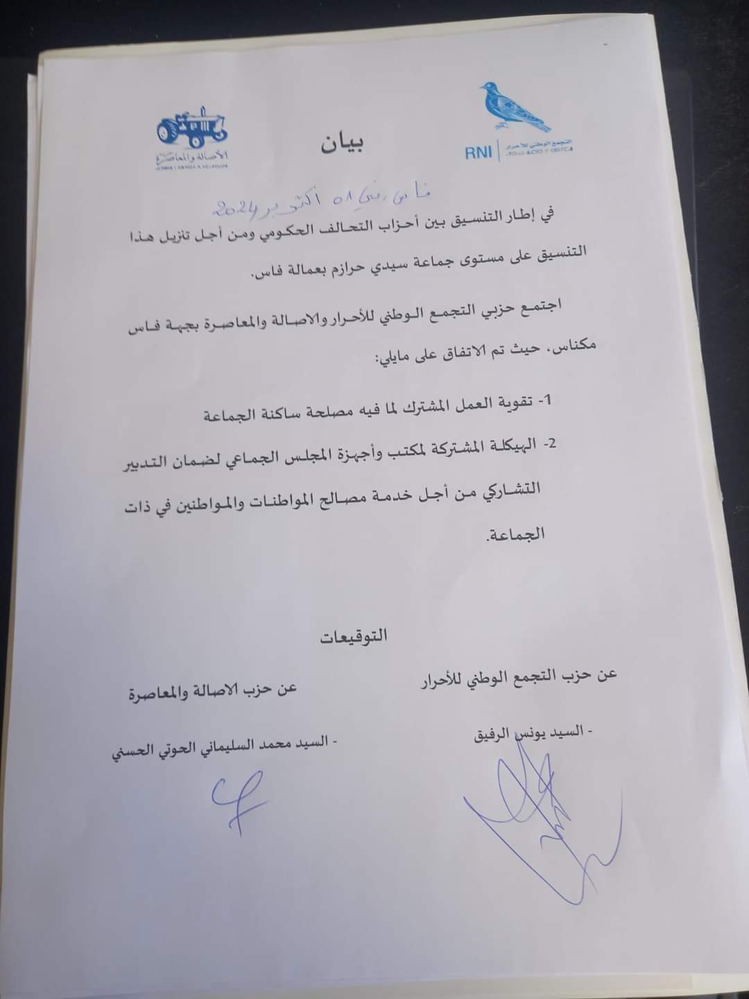 الأحرار و “البام” كانوا قد عقدوا إتفاقا موقعا بين الاطراف في محاولة الحفاظ على التكتل و التحالف السياسي بجماعة سيدي أحرازم دون الاتفاق النهائي عن تشكيلة المكتب،إلا أن أعضاء حزب الاصالة و المعاصرة إستفاقوا على إقصائهم من المناصب الاولى بالمكتب الجديد وهو ما إعتبروه خيانة و تم بيعهم من طرف المنسق الجهوي للحزب محمد أحجيرة الذي سبق و ان قدم لهم وعودا مزيفة.